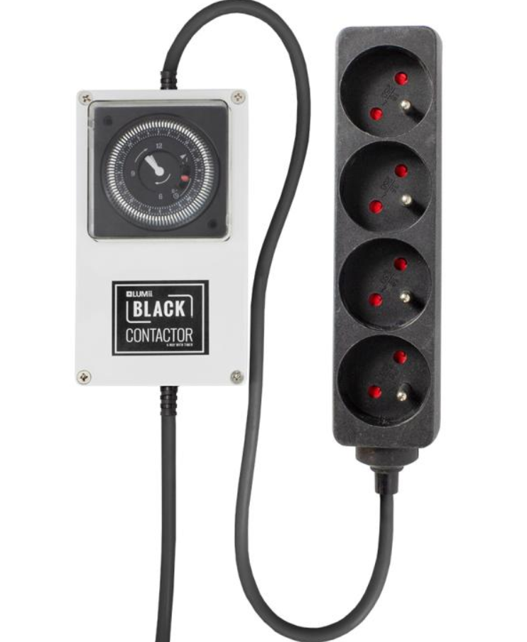 Le LUMii Black Contactor 4 entrées vous permet l'allumage temporisé de plusieurs lampes MH ou HPS alimentées par des ballasts magnétiques ou électroniques ne dépassant pas la charge maximale autorisée de 16A.