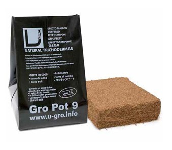UGro Pot9 est un sac-pot de fleur flexible contenant une brique de coco déshydraté de 900g, composée de 40% de tourbe de coco, 30% de fibres et 30% de copeaux. Il a des trous dans sa base pour faciliter le drainage. Son enveloppe extérieure a été traitée de façon à obtenir une excellente stabilité UV. Il permet d’obtenir jusqu’à 9 litres de tourbe de coco avec seulement 2 litres d’eau.
